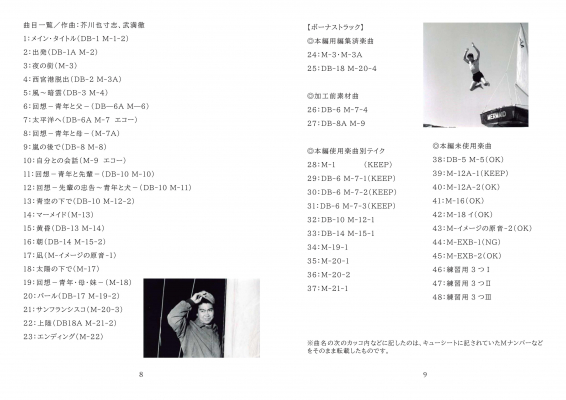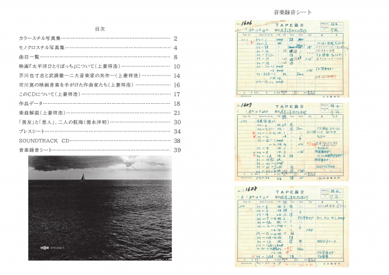 40ページBOOKの中身は、秘蔵のカラー、モノクロのスチル写真、音楽録音シートなど多数掲載! 映画評論家の上妻祥浩による楽曲ごとの詳細な解説と、新・3人の会の徳永洋明による、芥川也寸志と武満徹の音楽作法とその交友を踏まえた作品分析など豊富な内容となっています。読み物としてだけでなく資料価値も極めて高いBOOKとなりました。