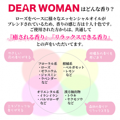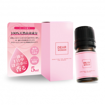 『Dear Woman』は、デリケートゾーンの臭いなど、女性特有の悩みを和らげるために開発した100%天然由来成分を使用したアロマエッセンシャルオイルです。下着やナプキン、パンティライナーなどに1滴垂らすだけで天然エッセンシャルオイルの上品でやさしい香りが1日中持続します。天然アロマオイルや漢方抽出物に特化したブレンド技術で作られており、使用した女性からは、デリケートゾーンの臭い対策だけでなく「癒される香り」「リラックスできる香り」で気分が落ち込みやすい生理中の気持ちのケアができるという感想もいただいています。