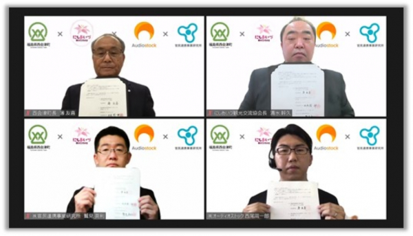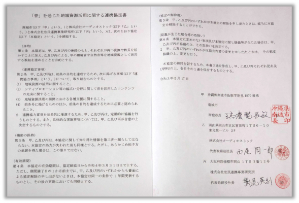 「まちづくりに企業の力を」を経営理念とする株式会社官民連携事業研究所(本社:大阪府四条畷市、代表取締役社長:鷲見 英利)は、2020年7月にスタートした株式会社オーディオストック社との共同プロジェクト「Sounds of JAPAN」を2021年5月17日に沖縄県南城市、5月25日に福島県西会津町、愛媛県松野町の2自治体、計3自治体と新たに連携協定を締結しました。