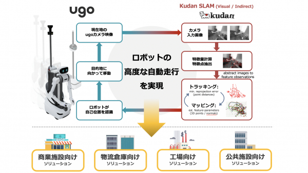 Kudan株式会社(本社:東京都渋谷区、代表取締役CEO:項 大雨、以下Kudan)は、本日、アバターロボットの開発を手掛けるugo株式会社(ユーゴー、本社:東京都千代田区、代表取締役CEO:松井 健、以下ugo)とパートナーシップ協定を締結しましたことをお知らせいたします。本提携を通じて、Kudan Visual SLAM※1とugo Platformが連携されることにより、多様且つ複雑な環境下においても、高度なロボットの自動走行が実現可能となります。また、オフィスビルのみならず、商業施設、物流倉庫、工場、公共施設といったあらゆる空間、または、頻繁なレイアウト変更や人が行き交う混雑した場所で事業を営む業種に向けて、高度なロボティクスソリューションを共同で展開してまいります。