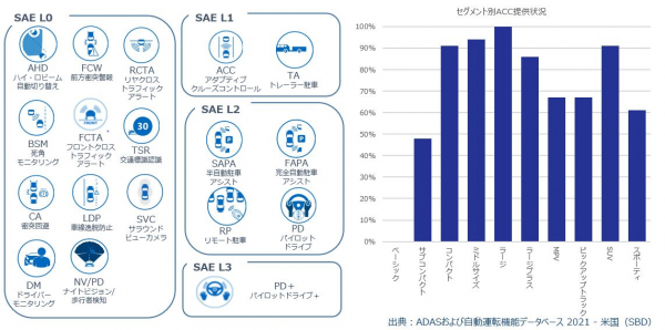 英国に本社を置き自動車技術に関する調査およびコンサルティングを手掛けるSBD Automotiveジャパン(名古屋市)では、米国で自動車メーカー37社が合計299車種で提供しているADAS(先進運転支援システム)の情報を集約した「ADASおよび自動運転機能データベース 2021 - 米国編」を2021年6月29日にリリースしました。