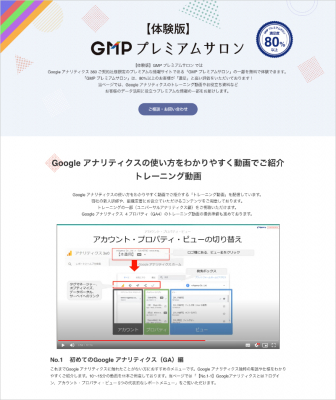 「【体験版】GMP プレミアムサロン」では、「トレーニング動画」の中から「Googleアナリティクスとは?ログイン、アカウント・プロパティ・ビュー 5つの代表的なレポートメニュー」を丸々1本ご覧いただけます。
