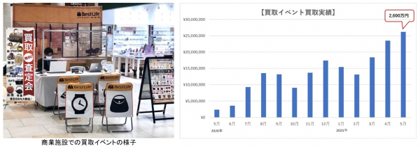 当社は、店舗のない地域の商業施設内にて週末限定の買取イベントが好調で、開催を促進しています。また、顧客層(ミドルアッパー層)が一致する、ゴルフ店や呉服店における臨時の買取コラボ出店も好調を博し、買取イベントの実績は右肩上がりで、2021年5月は最高額になりました。