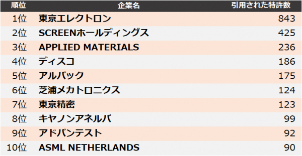 集計の結果、2020年に最も引用された企業は、1位 東京エレクトロン、2位 SCREENホールディングス、3位 APPLIED MATERIALSとなりました。