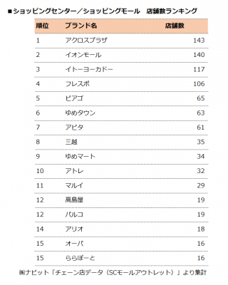 2位は140店舗のイオンモール、