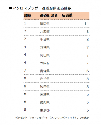1位のアクロスプラザは、福岡、北海道、千葉を中心に、全国各地で展開されているショッピングセンターです。