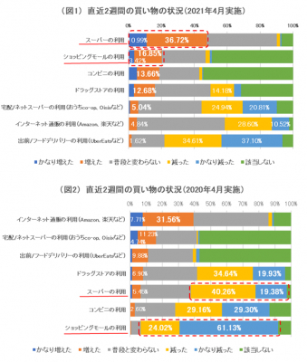 対して、インターネット通販の利用が、前回調査の「かなり増えた(7.71%)」「増えた(31.56%)」(図2)に比べ「減った(28.60%)」「かなり減った(10.52%)」(図1)となったことから、インターネット通販を利用していた層が、再びスーパーやショッピングモールに足を運ぶようにシフトしたと考えられる。
