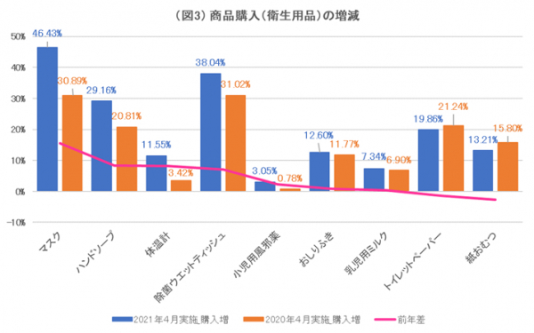 次に、直近2週間と昨年4月の緊急事態宣言時を比較した「商品購入の増減」を聞いところ、小さなお子さまのいる家庭でも「マスク」「手洗い」「検温」の生活が日常になっていることが明らかになった。図3は、昨年の緊急事態宣言時よりも購入が「かなり増えた」「増えた」と回答した被験者割合をグラフ化し、その前年との差を折れ線で示したものである。