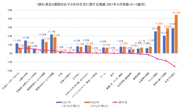 次に0〜2歳のお子さまの、直近2週間と、昨年4月の緊急事態宣言時の変化を聞いた。図6は、昨年の緊急事態宣言時よりも「かなり増えた」「増えた」と回答した被験者割合をグラフ化し、その前年との差を折れ線で示したものである。