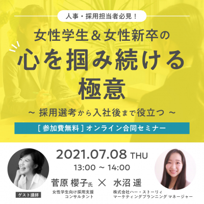 【人事採用教育】〜採用選考から入社後まで役立つ〜女性学生&女性新卒の心を掴み続ける極意 <7/8(木)13時〜無料オンラインセミナー>
