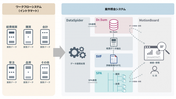 ・データ連携処理を行うDataSpiderにWebAPIも活用し「SPA」とデータ基盤ソリューション「Dr.Sum」を連携することで、ワークフローデータを格納できる