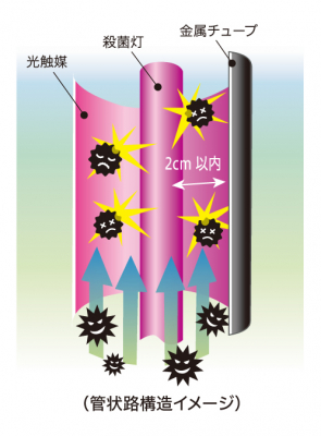 長寿命で強力な殺菌波長を持つ冷陰極管殺菌ランプ採用。殺菌ランプを挿入した流路の狭いトンネルの中を吸入したすべての空気が流れるため、紫外線強度の強い光でウイルス等が照射される仕組みになっています。