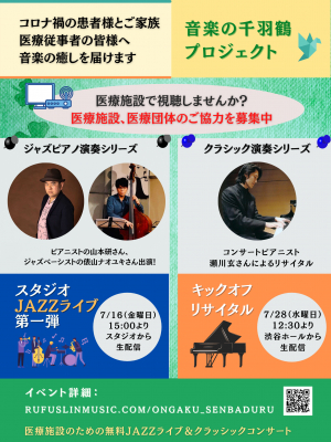 「音楽の千羽鶴プロジェクト」は医療従事者の方々へ感謝と応援の想いを、音楽の癒しを通じて届けたいというスローガンのもと、世界の音楽家によるジャズとクラシックの演奏を1000曲届けるという音楽プロジェクトです。全ての公演はYouTubeやClubhouseにて無料生配信されており、医療団体や医療施設のプロジェクトへのご協力を募集しています。施設内での視聴をご手配いただきたく存じます。