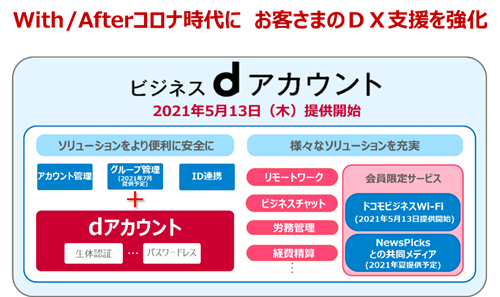 「ビジネスdアカウント」は、ドコモが2021年5月から提供を開始した法人さま向けの無料の共通認証IDです。