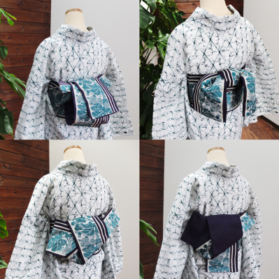 浴衣の着方と帯結び4種類(割り角出し・文庫・貝の口・矢の字)の中から1種類、好きな結び方を選んでレッスンします。