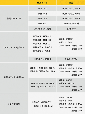 各ポート出力:ワイヤレス充電 最大10W、USB-A 最大30W、USB-C 最大100W