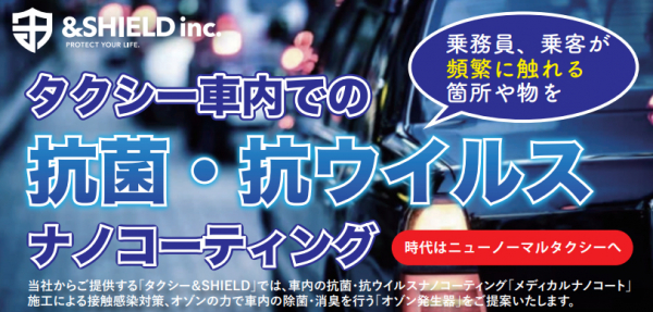 当社からご提供する「タクシー&SHIELD」では、車内の抗菌・抗ウイルスナノコーティング「メディカルナノコート」施工による接触感染対策、オゾンの力で車内の除菌・消臭を行う「オゾン発生器」をご提案いたします。