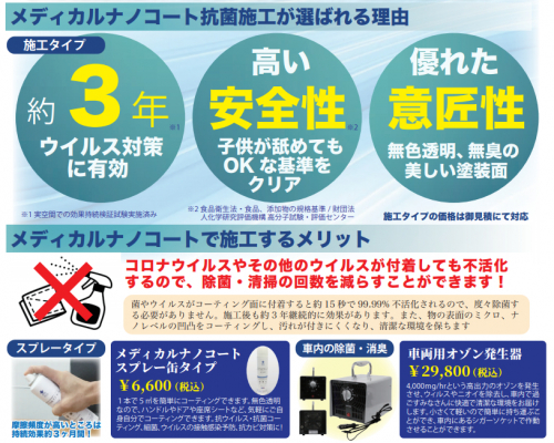 「メディカルナノコート」とは、接触頻度の高い物や場所にコートすることで、コーティング面に付着した細菌・ウイルスを不活化する特殊被膜ナノコーティング剤です。車内の座席、ドアノブやアシストグリップ等の共有部におすすめです。