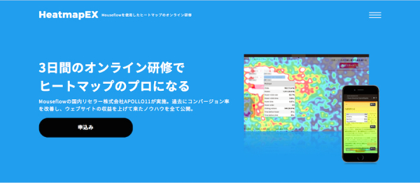 ヒートマップ解析ツール「Mouseflow」の日本公式リセラーを務める株式会社APOLLO11(本社:愛知県名古屋市、代表:吉丸彰)は、7月7日、Mouseflowを使ったヒートマップのオンライン研修サービスを開始したことをお知らせいたします。過去にコンバージョン率を改善し、ウェブサイトの収益を上げてきたAPOLLO11のノウハウを、3日間の研修を通して公開いたします。