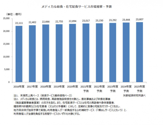 拡大を続けてきた病院給食(入院患者・病院職員の給食)、高齢者施設給食(入所高齢者・施設職員の給食)の市場は、前者は病院の統廃合や閉鎖、診療所の無床化が進み、病床数減少等で微減傾向が続き、後者は施設の新設がやや鈍化したため市場の安定期に入っている。また、在宅配食サービスは堅調に推移している。