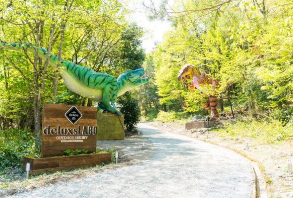 『デュラクスアウトドアリゾート京丹後久美浜LAO』は、京都府京丹後市の約3000坪の広大な敷地を使用。訪れた方々が“特別なひとときが味わえる”空間づくりと演出に注力しています。最大5名まで宿泊可能なドーム型グランピングテントを5棟設置し、ジャグジー、トイレ、シャワー、サウナなどの最新設備をご用意。さらに食事は地元の食材を利用した贅沢BBQをご堪能いただけます。また、エントランスには全長15メートルの可動式恐竜オブジェがお出迎えし、施設内のいたるところに恐竜や光る遊具を設置しており子供から大人までワクワクしていただける仕掛けを施しました。