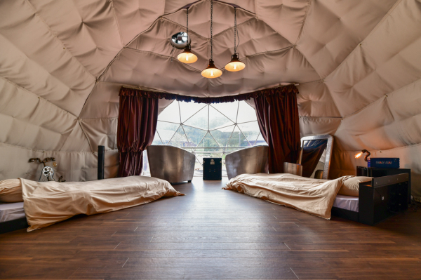 最大5人まで宿泊可能なテントにはトイレ、ジャグジー、シャワー、サウナを完備。(各棟によって宿泊人数が異なります。)窓もついており、自然光が入ってくるつくりとなっております。セミダブルベッドで眠ることができるので、ホテルに宿泊しているのと同じ感覚でゆったりお寛ぎいただけます。