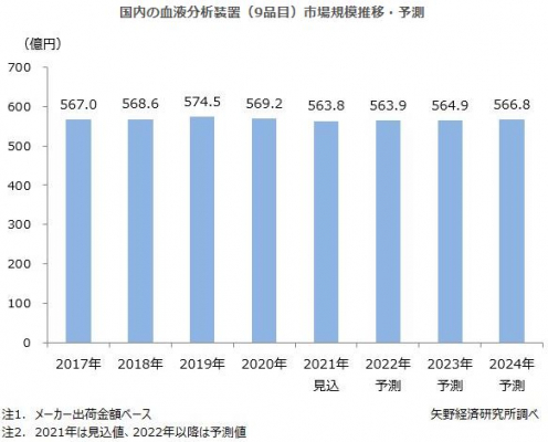 【矢野経済研究所プレスリリース】血液分析装置市場に関する調査を実施(2021年)2020年の国内血液分析装置市場規模は前年比0.9%減の569.2億円