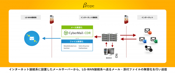 また、従来のネットワーク分離方式である“αモデル”における受信メールの無害化転送に加えて、“βモデル”においては、LG-WAN(総合行政ネットワーク)網向けの送信メールの無害化転送にも対応しております。