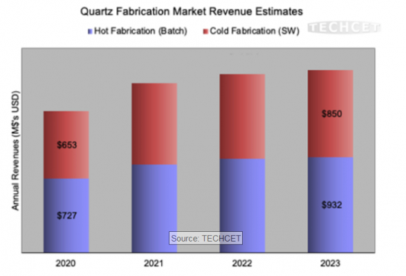 石英製造市場は2021年末までに2020年からの成長率は20%となる、16億5600万ドル規模に達することが予想されている。基材と製造部品の両市場の2020年から2025年までの5年間のCAGR(年平均成長率)はおよそ8%になると見込まれている。半導体装置市場の2021年の成長率は20%を超えることが見込まれ、石英部品の需要をさらに促進することになるとみられている。2022年までには需要に見合う供給ができることが予想され、次の波が来るまでに石英のサプライチェーンの拡大が必要となるだろう。