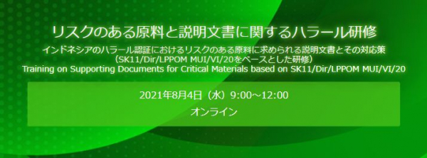 株式会社矢野経済研究所(本社:東京都中野区、代表取締役社長:水越 孝)は、インドネシアのハラール認証機関LPPOM MUIによる研修「リスクのある原料と説明文書に関するハラール認証〜インドネシアのハラール認証におけるリスクのある原料に求められる説明文書とその対応策[SK11/Dir/LPPOM MUI/VI/20をベースとした研修]」を、8月4日(水)9:00からオンライン開催いたします。