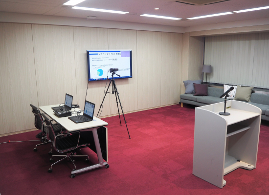 ・含まれる設備:配信用PC、投影資料用PC(各1台)/ビデオカメラ/スイッチャー/音響セット/返しモニター/机/椅子/演台/ハイチェア/インターネット回線(有線・無線)