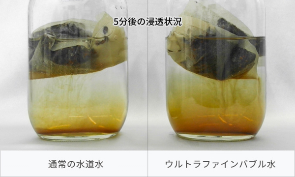 通常の水道水とミラブルキッチンのウルトラファインバブル水に市販の麦茶パックを入れた浸透力テストでは、ウルトラファインバブル水の方が早い段階から色づき始め、約5分後では右の写真の様な違いが確認できました。この様にウルトラファインバブル水は、食材の初期抽出や浸透にも効果が期待できます。