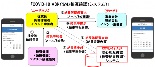 令和3年7月21日、関東経済産業局長認可のデジタルビジネス協同組合(代表理事 高瀬明宏;以下「DBCOOP」という)はCOVID-19新型コロナウィルスのワクチン接種結果やPCR・抗原・抗体の各種検査結果をスマホ等で表示し、経済・スポーツ・文化活動での「お互いの陰性での安心」を確認し合うことのできる「COVID-19安心相互確認システム(以下「COVID-19_ASK」という)」を開発し、テスト利用希望の企業・団体・組織等に提供すると発表した。