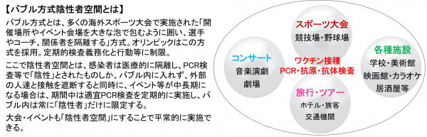 DBCOOPはこのような感染抑制のための経済・スポーツ・文化活動の制限下にあって、それと相矛盾するかも知れない「各活動の平常化」を継続する方法がないものかと検討を重ねてきました。それには、お互いに安心のできるワクチン接種証明や「有効期限内の検査結果」を提示するなどの方法を通じて、「見えるかたち」の健康かつ陰性の人々による、より平常に近い経済・スポーツ・文化活動を模索していくことが可能だろうと考えました。それが正に「バブル方式の陰性者空間」の実現ではないかと思われます。