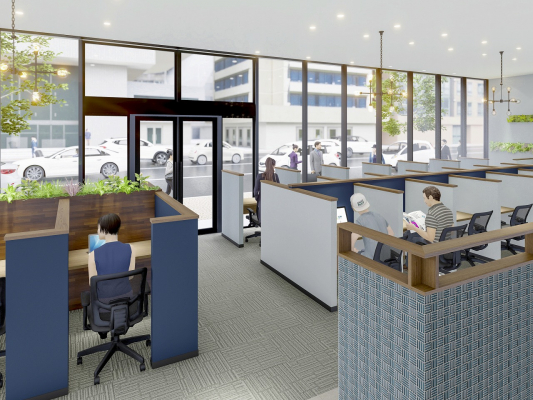 本シェアオフィスは、2021年6月竣工の「THE PEAK SAPPORO」の1Fにオープンします。フリー席59席、固定席10席、完全個室のレンタルオフィス42戸、総面積673.10m2の大型シェアオフィスとなります。「THE PEAK SAPPORO」には充実した共有ラウンジの他、見晴らしの良い休憩室などもあり大変便利です。