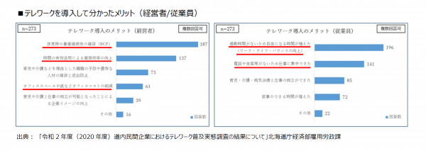 新型コロナウイルス感染症対策として急速に拡大したテレワーク。札幌市でも導入する企業が増えています。実際に北海道内で導入した企業からは「非常時の事業継続性の確保(BCP)」や「時間の有効活用による業務効率の向上」、「オフィススペースや紙などのオフィスコストの削減」がメリットとして挙げられています。また従業員からも「通勤時間がないため自由になる時間が増えた(ワーク・ライフ・バランスの向上)」や「電話や来客等がないため仕事に集中できた」といった声が聞かれています。