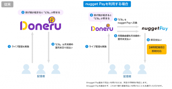 今回の業務提携により、Doneruの配信者は、配信から報酬の受け取りまで従来1ヶ月以上時間を要していましたが、ナゲットペイを経由していただくことで報酬金額が確定次第、即日で受取可能となりました。なお、換金時に発生する振込手数料はナゲットペイが負担いたします。