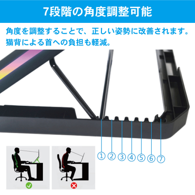 ・【 7段階の角度調整 】エルゴノミクスデザインで、首や肩が疲れにくい角度で使用できる。