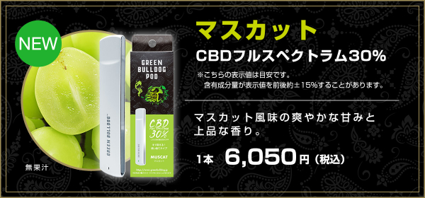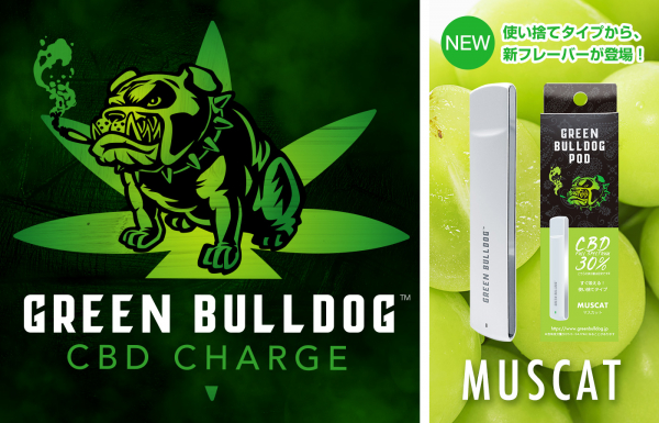 CBDブランド【GREEN BULLDOG】から、CBDフルスペクトラム30%の「マスカット」フレーバーの使い捨てポッドタイプが新登場!!