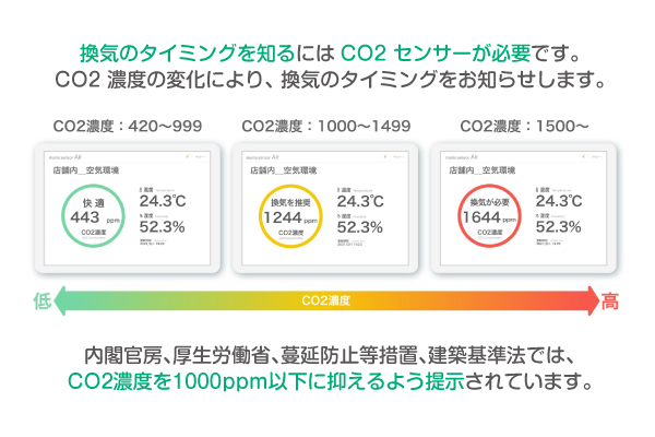CO2濃度の変化により、換気のタイミングをお知らせします。