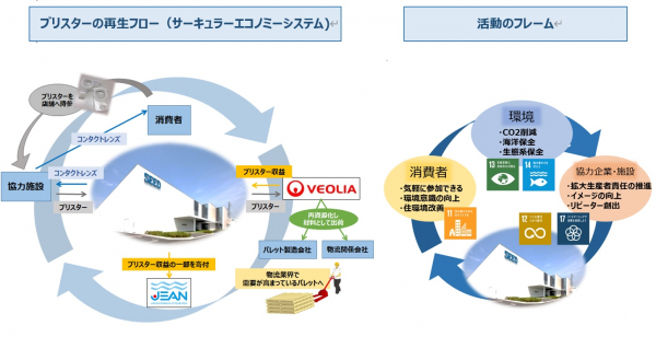 概 要:プラスチックを製品に使用している企業の責務として、サーキュラーエコノミーシステムの構築によるプラスチックの再資源化を目的としたプロジェクト。当社と提携している眼科やコンタクトレンズ販売店などにブリスターの回収ボックスを設置し、自社製品問わずコンタクトレンズ関連の廃棄プラスチック材を回収。収集された廃プラスチック材はヴェオリア・ジェネッツが購入し、物流パレットとして再製品化。さらなる環境改善につなげるため、当活動によって生じた利益は、「美しい海をこどもたちへ」をモットーに海洋ごみ問題解決に向けて活動している一般社団法人JEANに全額寄付を行う。