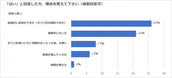 過去にタバコを吸っていた方に対し「禁煙してよかったですか」という質問に対して96%が「はい」と回答しました。理由は「金銭的に余裕ができた」が55%、「健康的になった」が45%と上位を占めております。