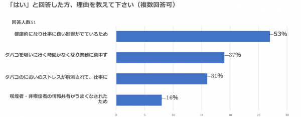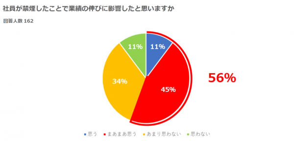 今回、「社員が禁煙したことで業績の伸びに影響したと思いますか」という質問に対しては56%が、「思う」と回答しました。1位の理由は「健康的になり仕事に良い影響がでているため」で52%という結果となりました。