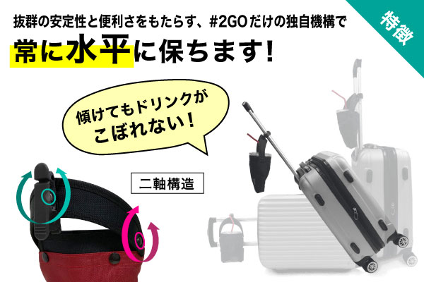 傾けてもドリンクがこぼれない、抜群の安定性と便利さをもたらす、独自機構(二軸構造)で常にバッグを水平に保ちます。