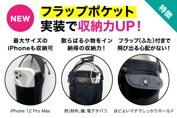 2021年は、#2GOシリーズについていたサイドポケットから「フラップ(ふた)ポケット」に!収納力が大幅にアップしました。スマートフォンも入る大判ポケットになっています。フラップをしめれば、傾けても小物が飛び出ません。貴重品やワイヤレスイヤフォン、電子タバコ等々、マチがついているので入れておくのに便利です。