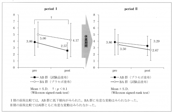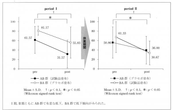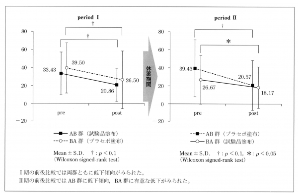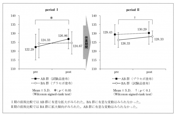 膝関節可動域の結果では,I期の前後比較において,試験品を塗布した際の左膝の可動域が有意に拡大しました。さらにII期においても試験品を塗布した際に,左右の膝の可動域が拡大傾向を示しました。II期では低下傾向にとどまりI期のみ統計学的有意な拡大が示されたと考えられます(Figure3)。