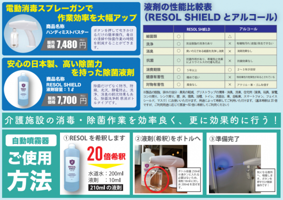 この度、株式会社AND SHIELD (本社:横浜市神奈川区、代表取締役社長:佐藤 渉)は、介護の現場で使用する車椅子や送迎車に対する事業者様の「接触感染」対策をサポートするため、除菌洗浄剤「RESOLSHIELD」及び自動ミスト噴霧器「ハンディミストバスター・ライト」をパッケージとする『介護施設&SHIELD』のご提供を7月28日(水)より開始いたします。