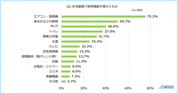 ・在宅でのテレワークによって、実際に使用頻度が増えたものとして、「エアコン・扇風機」(75.3%)、「蛍光灯などの照明」(50.7%)、「Wi-Fi」(40.0%)が上位となった。