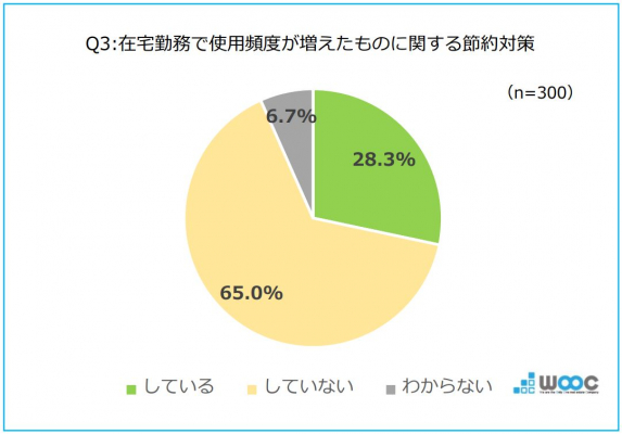 ・在宅でテレワークを実施している人の多くが、電気代をはじめ何らかの費用や機器類の使用頻度の増加を意識しているものの、節約行動をとっている人は3割に満たず、節約対策をしていない人は全体の65%を占める結果となった。