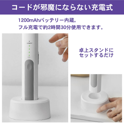 ・【 USB充電式 】 スタンドに置いたまま充電できる。